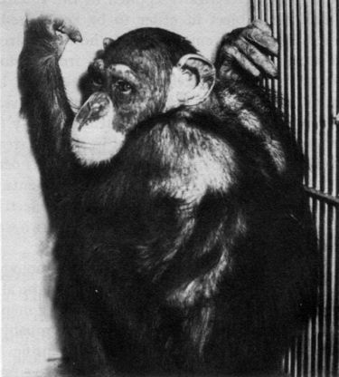 This speculation is supported by the following experiments completed in June, 1969, in collaboration with Drs. Johnston, Wallace, and Bradley. Chimpanzee Paddy (Figure 3), while free in her cage, was equipped with a stimoceiver to telemeter the brain activity of her right and left amygdaloid nuclei to an adjacent room, where these waves were received, tape-recorded, and automatically analyzed by an on-line analog computer. This instrument was instructed to recognize a specific pattern of waves, a burst of spindles, which was normally present in both amygdaloid nuclei for about one second several times per minutes The computer was also instructed to activate a stimulator, and each time the spindles appeared, radio signals were sent back to Paddy's brain to stimulate a point in her reticular formation known to have negative reinforcing properties. In this way electrical stimulation of one cerebral structure was contingent on the production of a specific EEG pattern by another area of the brain, and the whole process of identification of information and command of action was decided by the on-ine computer.